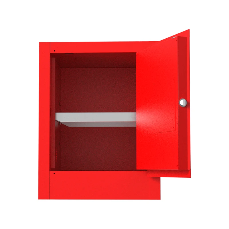 Шкафът за съхранение на горими химикали е конструиран с двуслойна структура от стоманена плоча, която значително подобрява здравината и стабилността на корпуса на шкафа. В промишленото производство, когато е изправен пред чести боравене и сблъсъци, той може да осигури надеждна физическа защита за запалимите химикали, съхранявани вътре, предотвратявайки потенциални опасности, причинени от изтичане на запалими предмети поради повреда на шкафа. Подходящ е за места като складове за химически суровини.